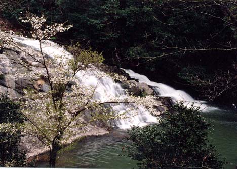 二畳ヶ滝 高さ約30メートル、幅7メートル、岩盤が重なって激流が二層になって落下するところが、この名の由来。 大蛇が住むといわれる穴があり、「昔、この付近に大蛇あり。目撃せし人は蛇の毒気に当てられて、熱病にうなされる」とか「滝壷には竜神が住み、滝に触れると祟りがあって、人命を奪い、洪水をおこす」など多くの伝承がある。 大雨の後が、水量が多く見ごたえがあります。